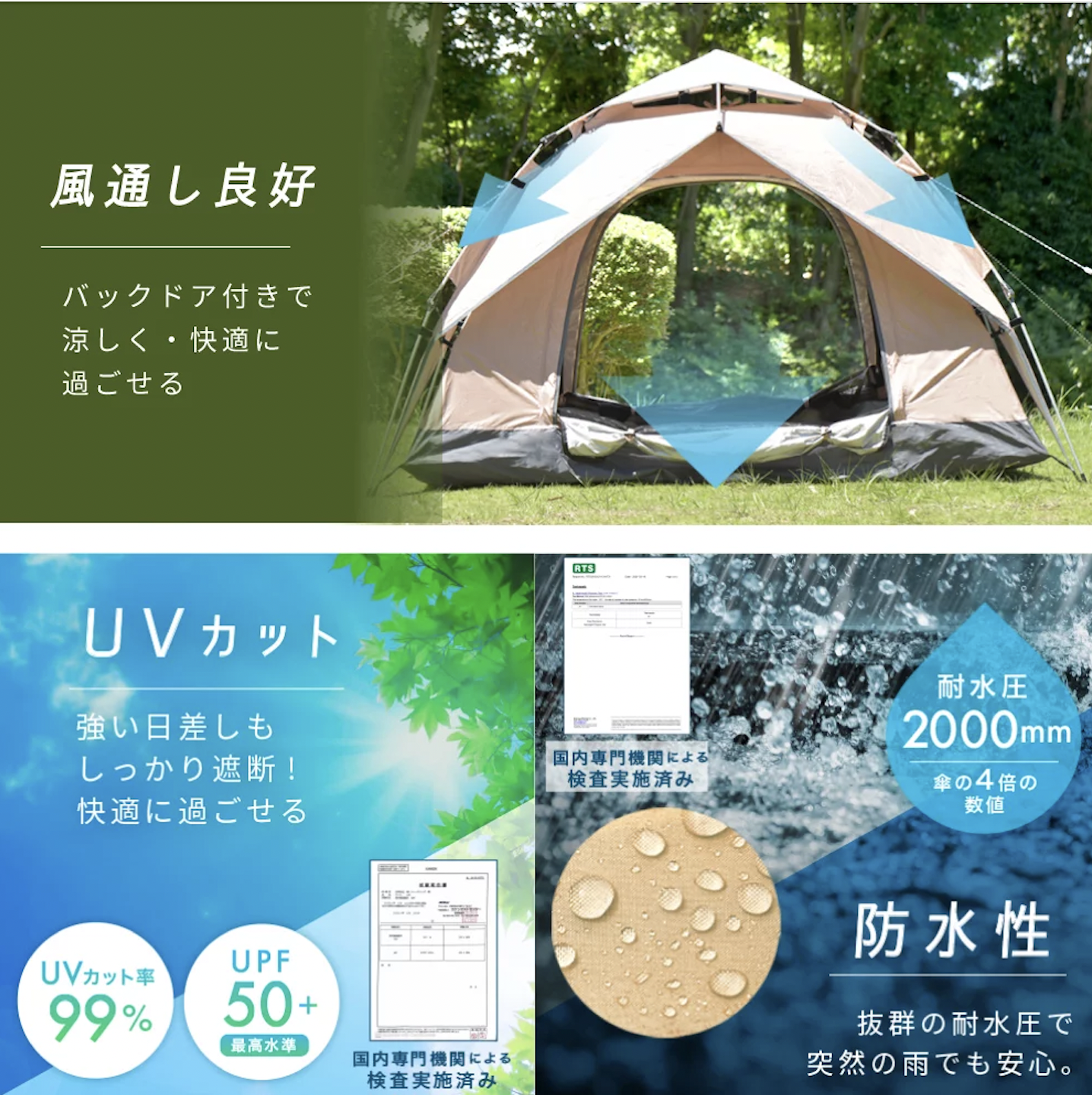 生地には耐久性に優れた190Tのポリエステルを採用!紫外線を99%カットし、紫外線遮蔽率はUPF50+を実現。いかなる天候にも耐え、色あせやひび割れ、摩擦に強く、強度、耐久性を備えています。【耐水圧2000mm】もあるので、ちょっとした雨や夜露で生地が濡れる心配もありません。また通気性もよく、湿気は適度に外に逃すため、通気性と快適な居住空間の確保を同時に叶えます!