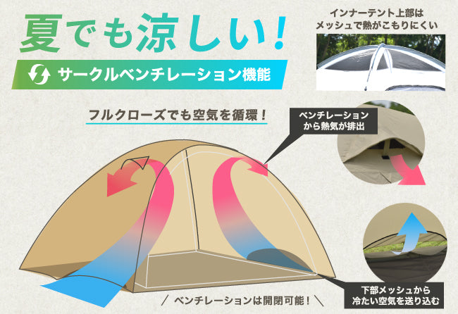前室内の風を逃がし強風が吹いてもテントを揺れにくくする効果があります。