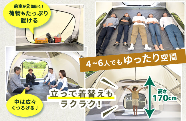 家族や大人数の仲間でも広々くつろげる4~6人用ビッグサイズドームテント!高さも170cmもあり、立って着替えもラクラクです。【リビングスペース2倍で快適な居住空間!】前後にキャノピーポールを設置すると居住空間が2倍になり、リビングスペース、日よけスペース、大容量の荷物置きスペースとしても活躍します。