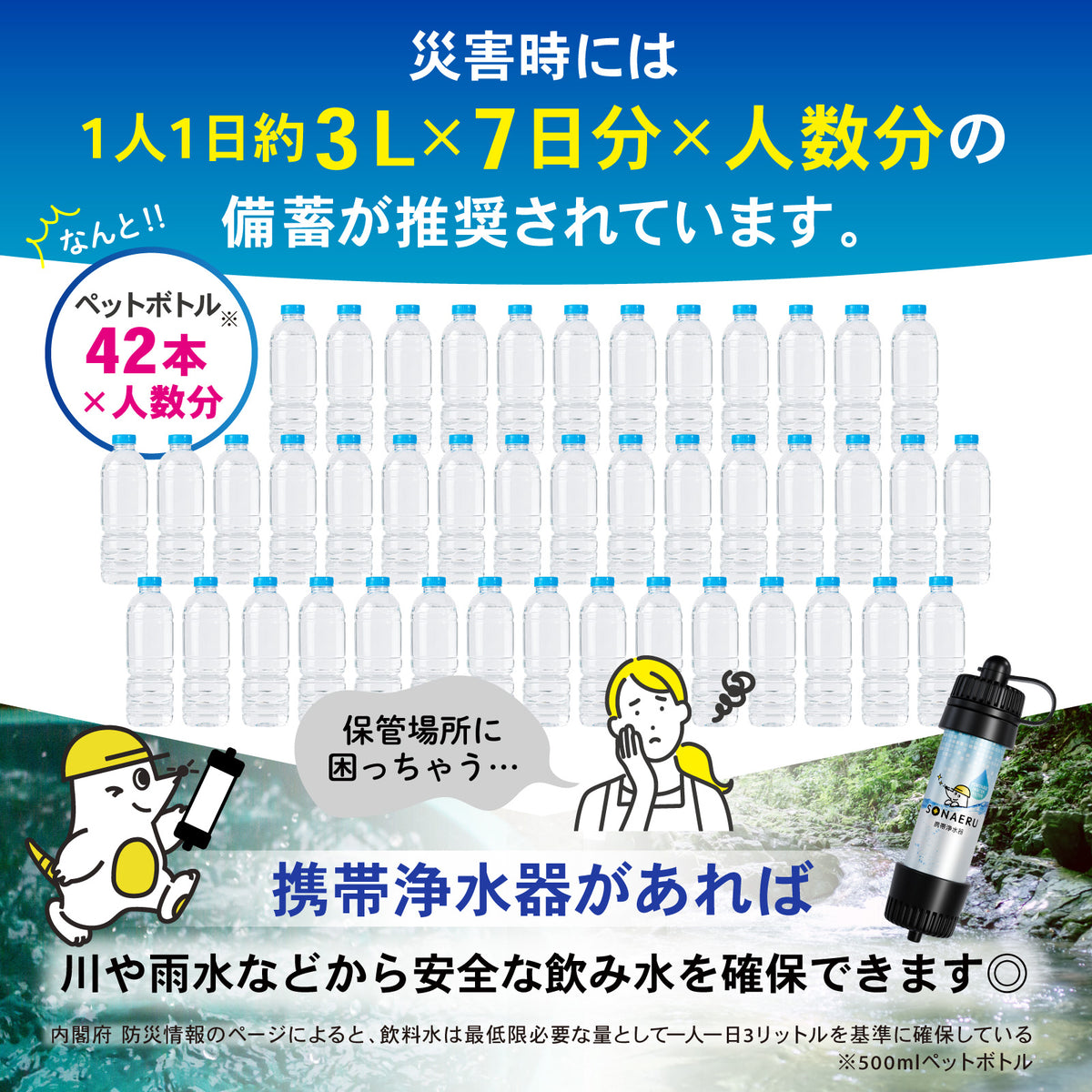 1本で500mlペットボトル約16,000本分。屋外活動や災害後、限られた水資源のろ過に十分対応。スピーディーな処理能力(1分あたり最大1,000ml)も実現。