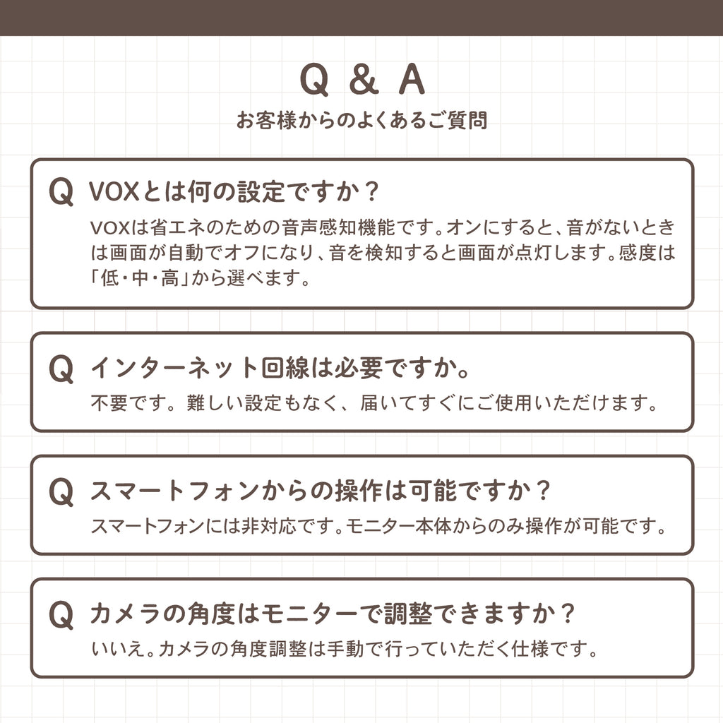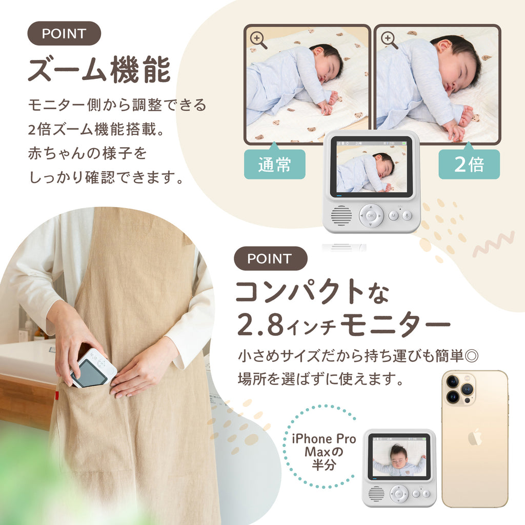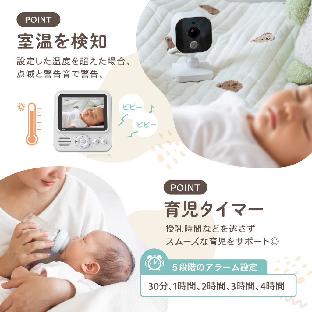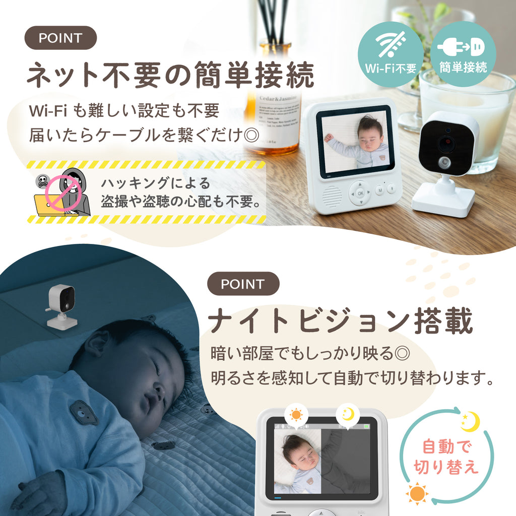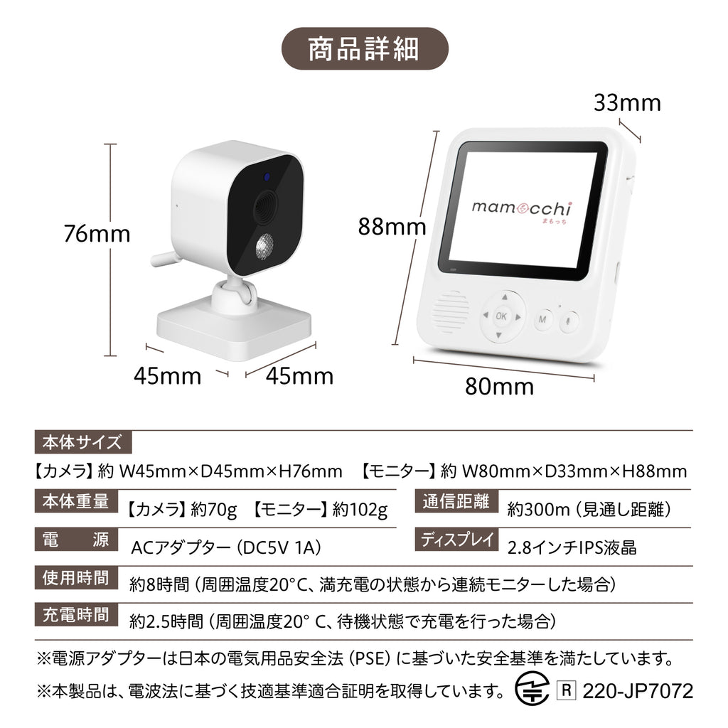 - 機能:双方向通話、暗視モード、子守唄6曲、ホワイトノイズ2種、VOX音声感知