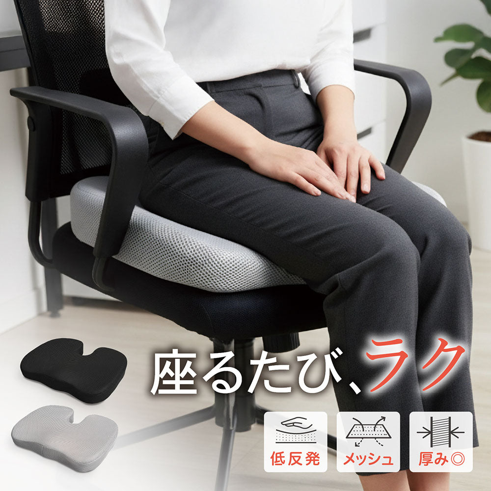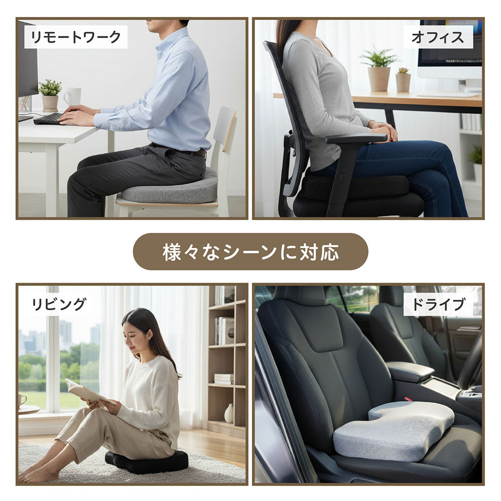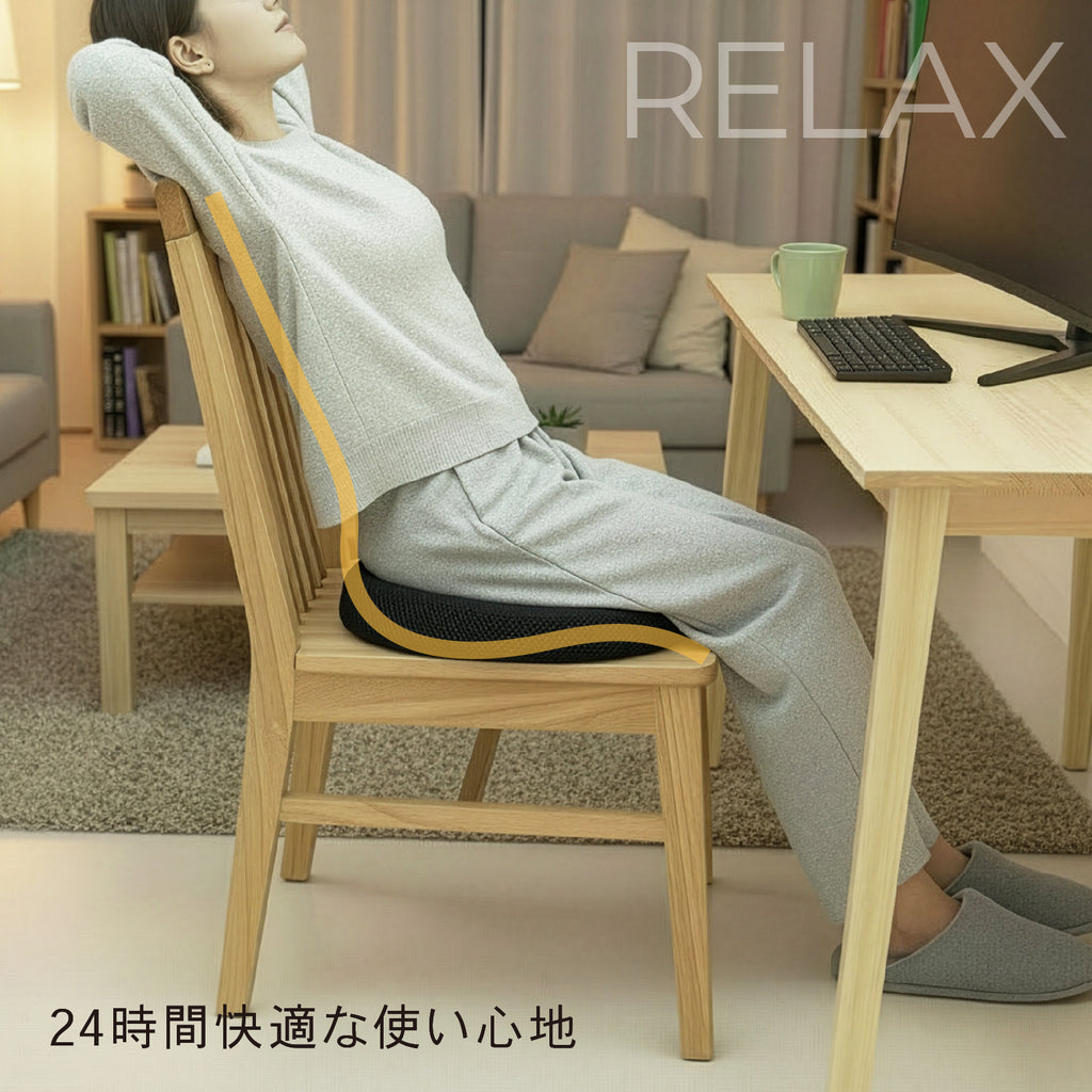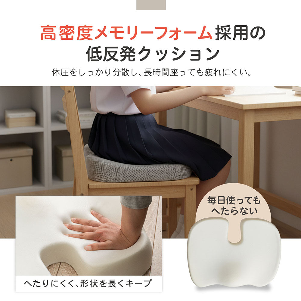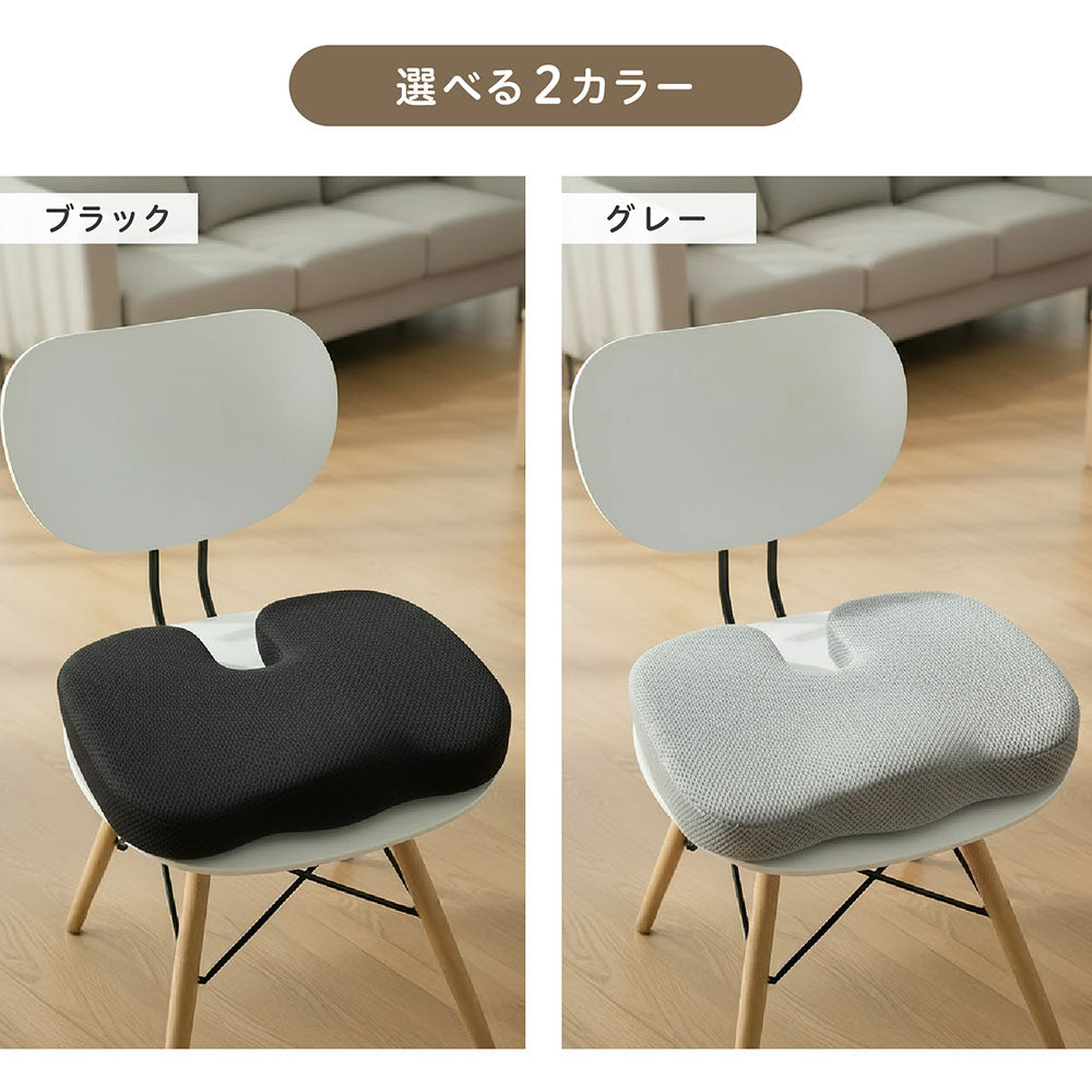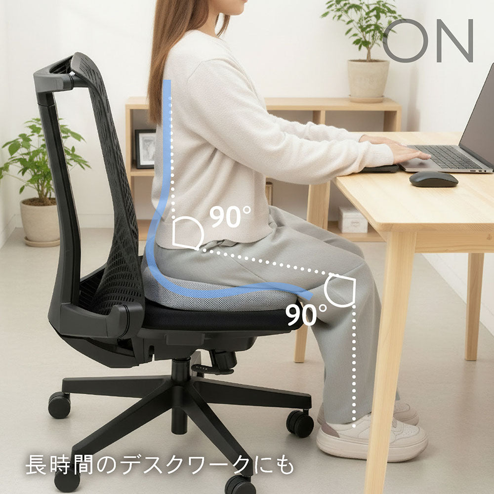 尾てい骨部分を避ける「U字型デザイン」と、お尻の形にフィットする立体構造が、圧迫感を軽減し正しい姿勢へと導きます。