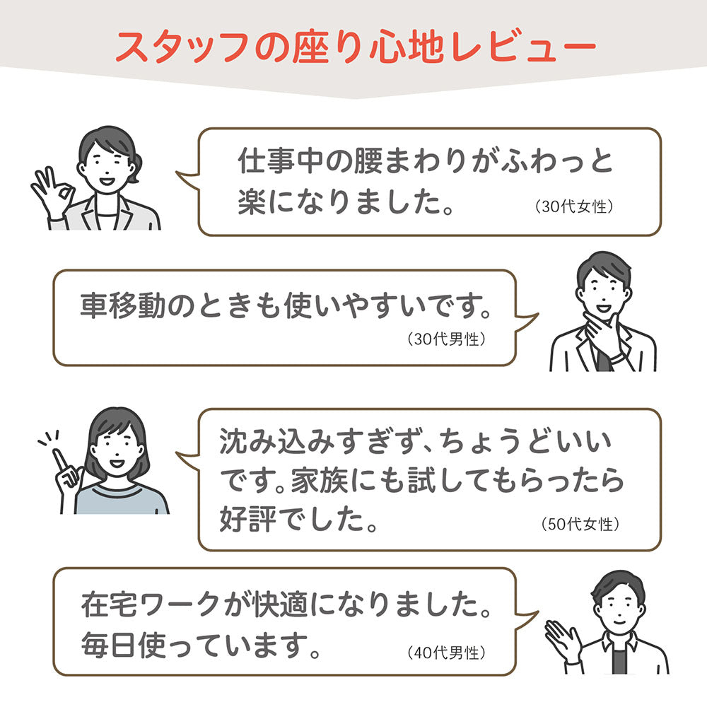 デスクワークで使用していますが、これを使ってから長時間座っていても腰が楽になりました。フィット感が良く、包み込まれるような感覚です。