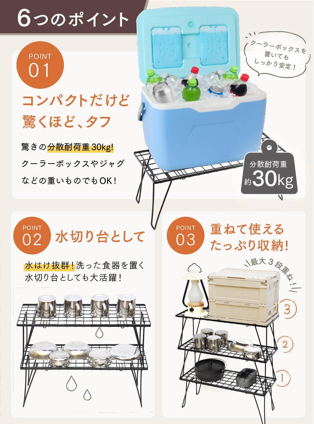 【耐荷重30KG】軽量・コンパクトなのに驚くほど、タフ。ジャグやクーラーボックスも置ける耐荷重30kg!地面に直置きしたくなかった重量物も気軽に置けます。【気配り設計】脚は折りたたみ式で初心者も簡単組立!収納時は脚をたたんだときに垂れ下がってこないストッパー付き。