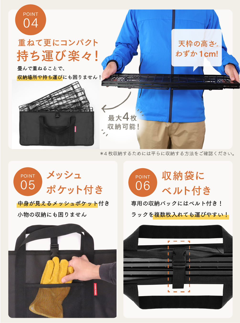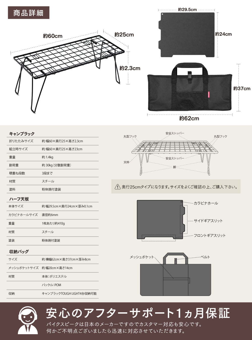 【軽量・コンパクト】重量約1.4kgで持ち運びラクラク!2枚重ねると脚が枠内に収まるのでさらにコンパクトに収納出来ます。また奥行約25cmでテント内にも置けるちょうどいいサイズ!【収納バッグ付属】キャンプラックが3枚入る専用バッグが付属しているため、持ち運びに便利です。